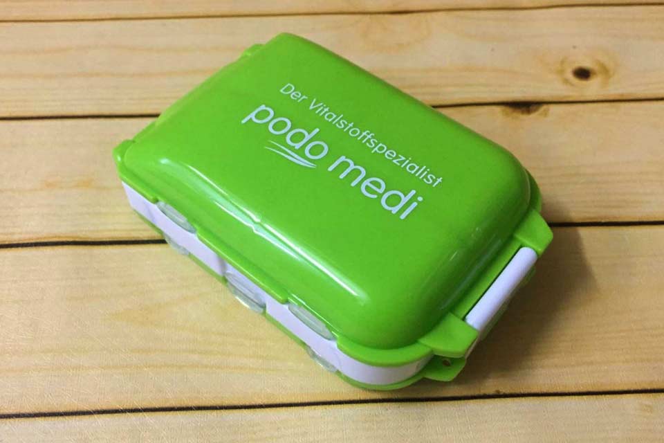 Hier finden Sie Zubehör für Ihre Nahrungsergänzungsmittel, wie z.B. die praktische Podo Medi-Pillendose. In dieser robusten Kunststoff-Box haben Sie Ihre Tabletten oder Vitaminkapseln immer zur Hand, ob zuhause oder unterwegs. Es passen viele Tabletten oder Kapseln rein, mit einer guten Aufteilung der einzelnen Fächer.